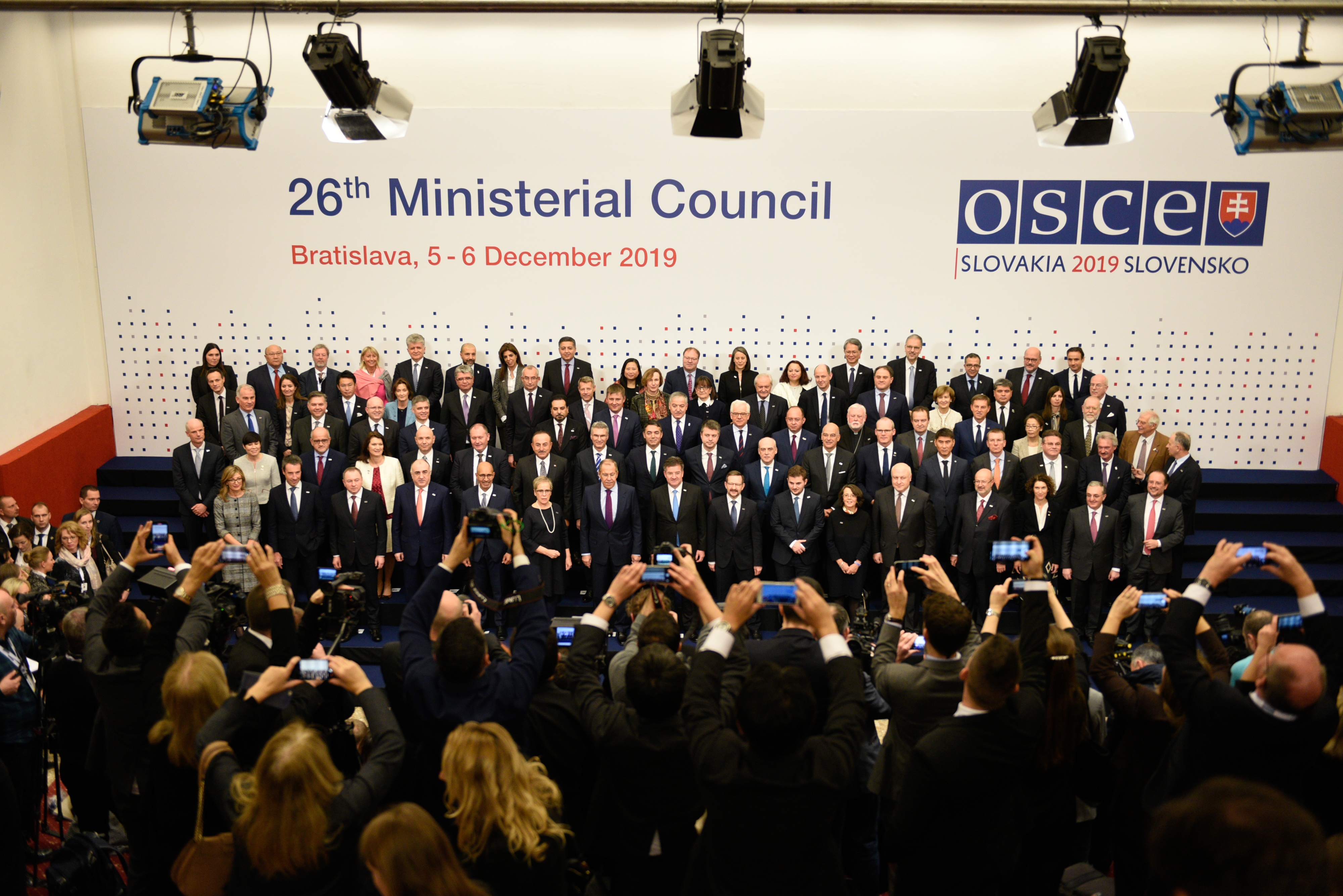OSCE Foreign Ministers and Heads of Delegations pose for a family photo at the 26th OSCE Ministerial Council in Bratislava, 5 December 2019. Photo Credit: OSCE