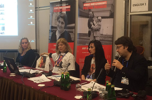 Representatives of the government of Azerbaijan were also present at the event. Among other remarks a government representative said that those imprisoned human rights defenders should have thought about the impact on their families in case of their imprisonment. Dinara Yunus, daughter of Leila and Arif Yunus, replied that she was proud of her parents and wished everybody had such parents. Dinara went on to describe critical condition of Yunus couple. Leila has hepatitis C and diabetes, Arif had a stroke during one of the court hearings during the summer. Dinara is afraid that the trial could have been the last time her parents, who lived together happily for 37 years, saw each other alive. Considering the health condition of Yunus couple they should be released on humanitarian grounds. Otherwise their sentence in fact becomes death penalty.