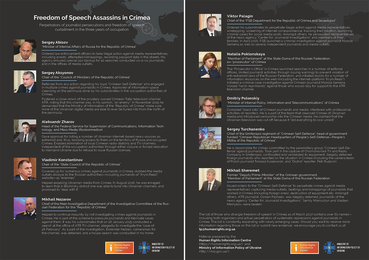 According to the Human Rights Information Centre, 10 persons bear the biggest brunt of responsibility for cracking down on the freedom of speech and expression of opinion in Crimea. These include Sergey Abisov, “Minister of internal affairs of Russia for the Republic of Crimea”;Sergey Aksyonov, Chair of the “Council of Ministers of the Republic of Crimea”; Aleksandr Zharov, Head of the Federal Service for Supervision of Communications, Information Technology, and Mass Media (Roskomnadzor); Vladimir Konstantinov, Chair of the “State Council of the Republic of Crimea”; Mikhail Nazarov, Chief of the Main Investigative Department of the Investigative Committee of the Russian Federation for the “Republic of Crimea”; Viktor Palagin, Chief of the “FSB Department for the Republic of Crimea and Sevastopol”;Natalia Poklonskaya, “Member of Parliament” at the State Duma of the Russian Federation, ex-“prosecutor” of Crimea; Dmitriy Polonskiy, “Minister of Internal Policy, Information and Telecommunications” of Crimea; Sergey Turchanenko, former Chief of the Simferopol regiment of “Crimean Self-Defence”, head of budget-sponsored institution “Crimean Republican Headquarters of People’s Self-Defence—People’s Militia of the Republic of Crimea”; Mikhail Sheremet, Former “Deputy Prime-Minister” of the Crimean government, “Member of Parliament” at the State Duma of the Russian Federation.