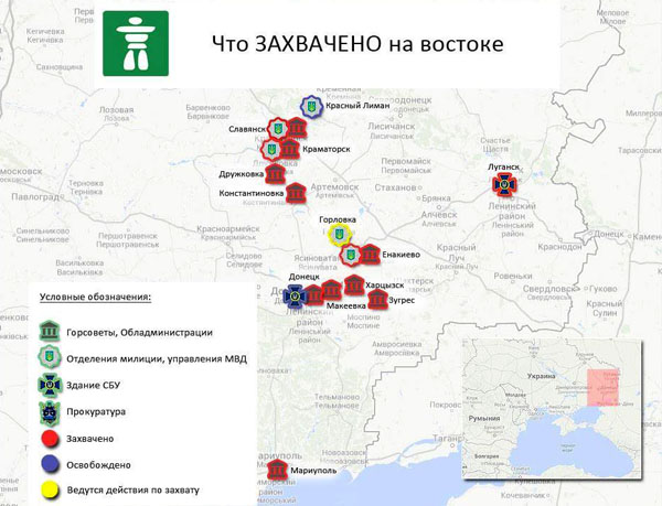 Ситуация в Восточной Украине все более напоминает «крымский сценарий», несмотря на существенные отличия между регионами. Идентичен не только алгоритм действий пророссийских активистов (захват административных зданий и оружия – провозглашение «новой народной власти» – оглашение референдума), но и «стиль». К примеру, так же, как в Крыму пытались подкупать украинских военнослужащих (о чем рассказывали активистам ЄвромайданSOS сами военные), на Востоке ФСБ пытается «скупать» украинскую милицию (об этом заявляет оппозиционный лидер Юрий Луценко).